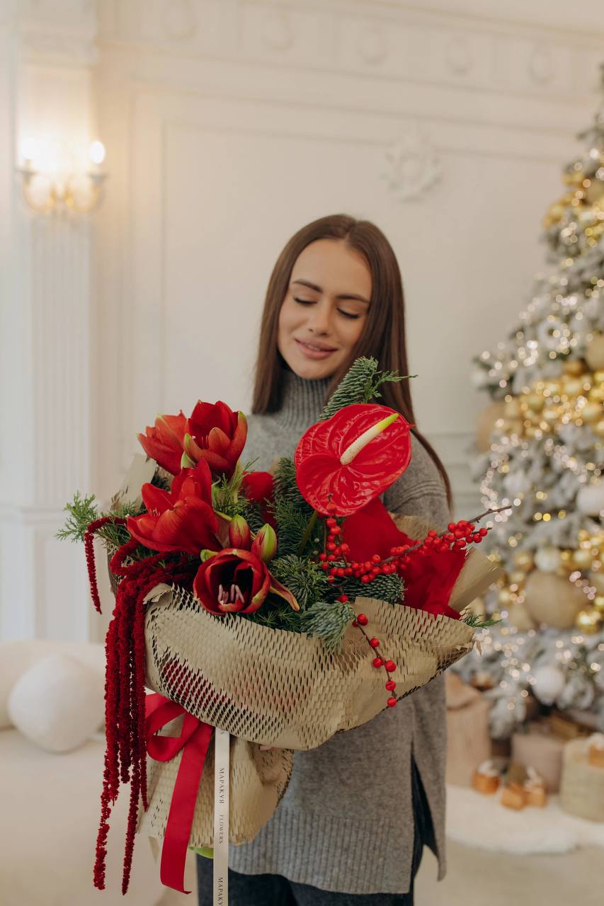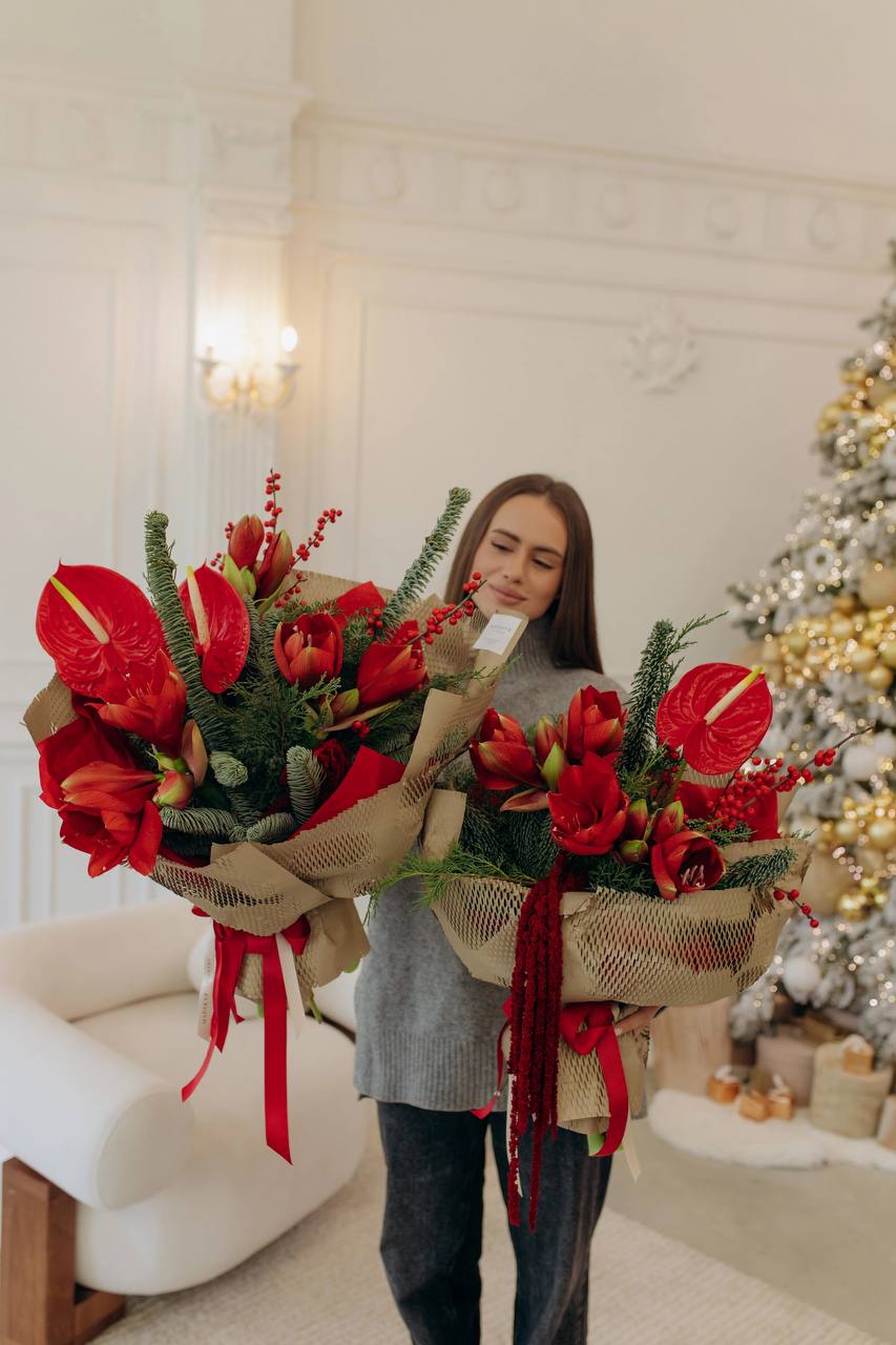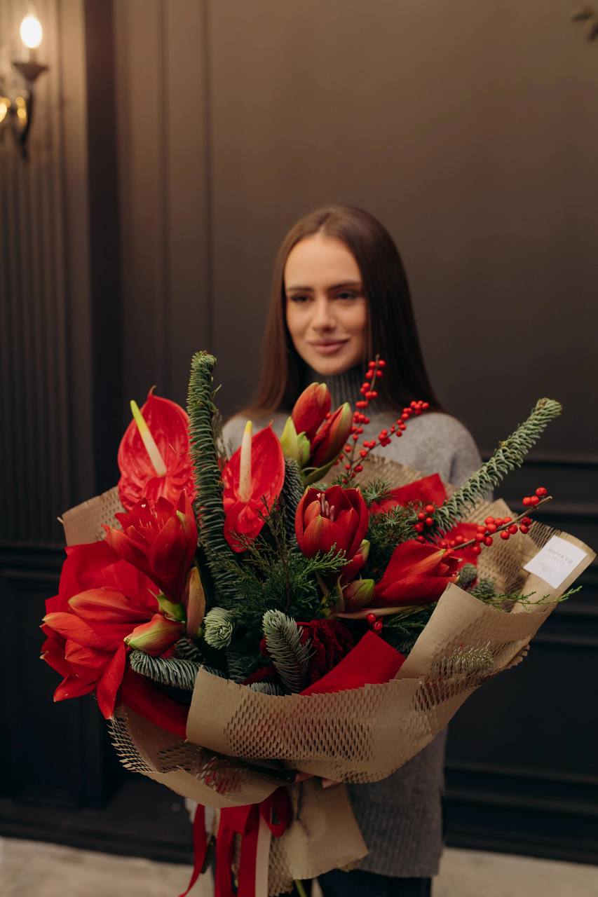Склад букету розмір L: амариліс(3 шт.), антуріум(2 шт.) , іликс(2 шт.) , різні види хвої, упакування.