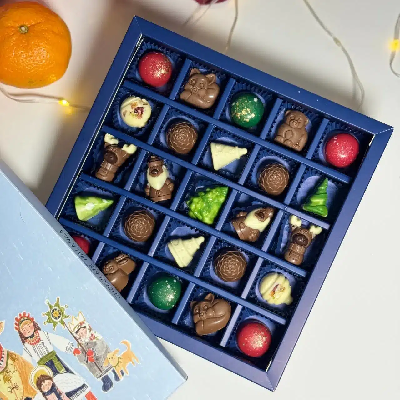 25 фігурних цукерок у вигляді святкових персонажів з пралінованими, карамельними, фундуковими, мигдалевими та фруковими начинками, в білому, молочному та чорному шоколаді.